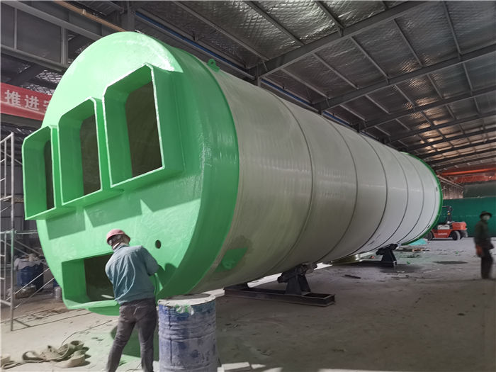一體化污水泵站是生活、市政雨污水為一體的預(yù)制提升泵站。復(fù)合纏繞玻璃鋼筒體為主體,內(nèi)設(shè)潛污泵、自動(dòng)耦合裝置、管道、閥門、控制系統(tǒng)、爬梯、維修平臺(tái)等,進(jìn)水口加設(shè)提籃格柵或粉碎型格柵,筒體上設(shè)有玻璃鋼頂蓋,是把所有設(shè)備及儀表集成在一起的成套設(shè)備。